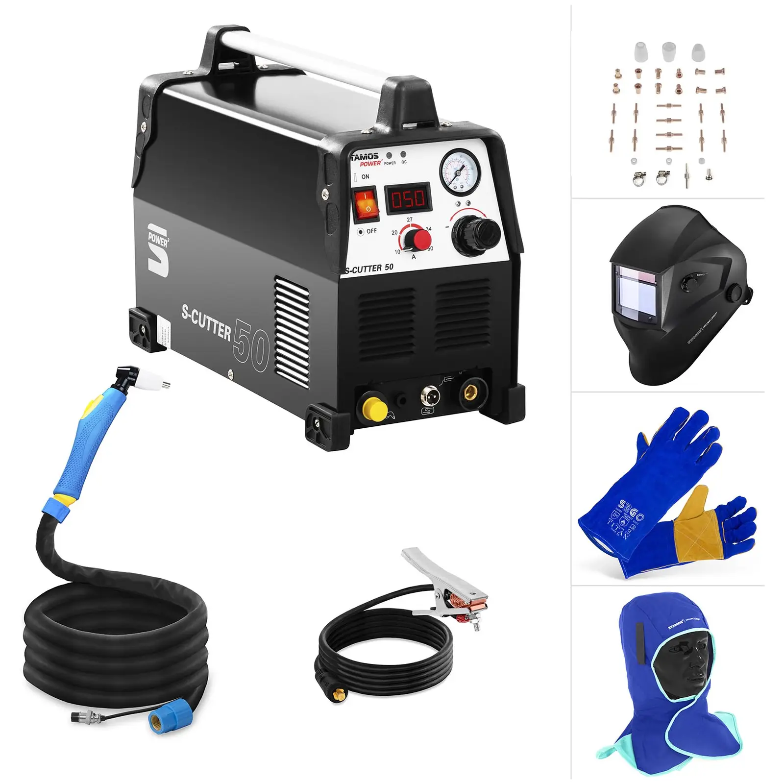 Mit dem Plasmaschneider S-Cutter 50 von Stamos Power haben Sie alle Parameter zum Schneiden von leitenden Metallen sicher im Blick. Dabei überzeugt er durch eine hervorragende Schnittqualität. Mit einer Einschaltdauer von 60 % bei 50 A kann er seine anhaltende Leistungsfähigkeit unter Beweis stellen. Ein Schweißhelm, eine Schweißerhaube, Schweißerhandschuhe sowie ein Sortiment an Ersatzteilen vervollständigen dieses Set zu einer umfangreichen Lösung, wenn Sie professionell Metall schneiden wollen.